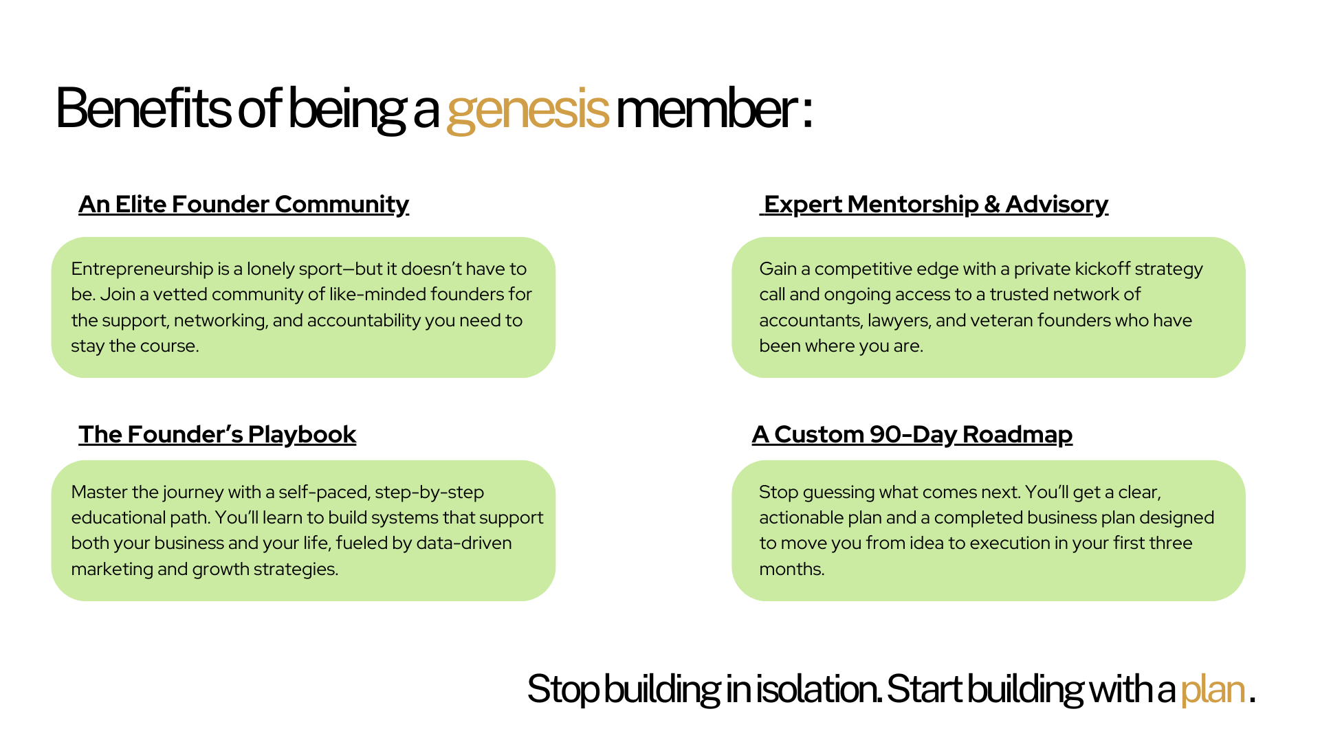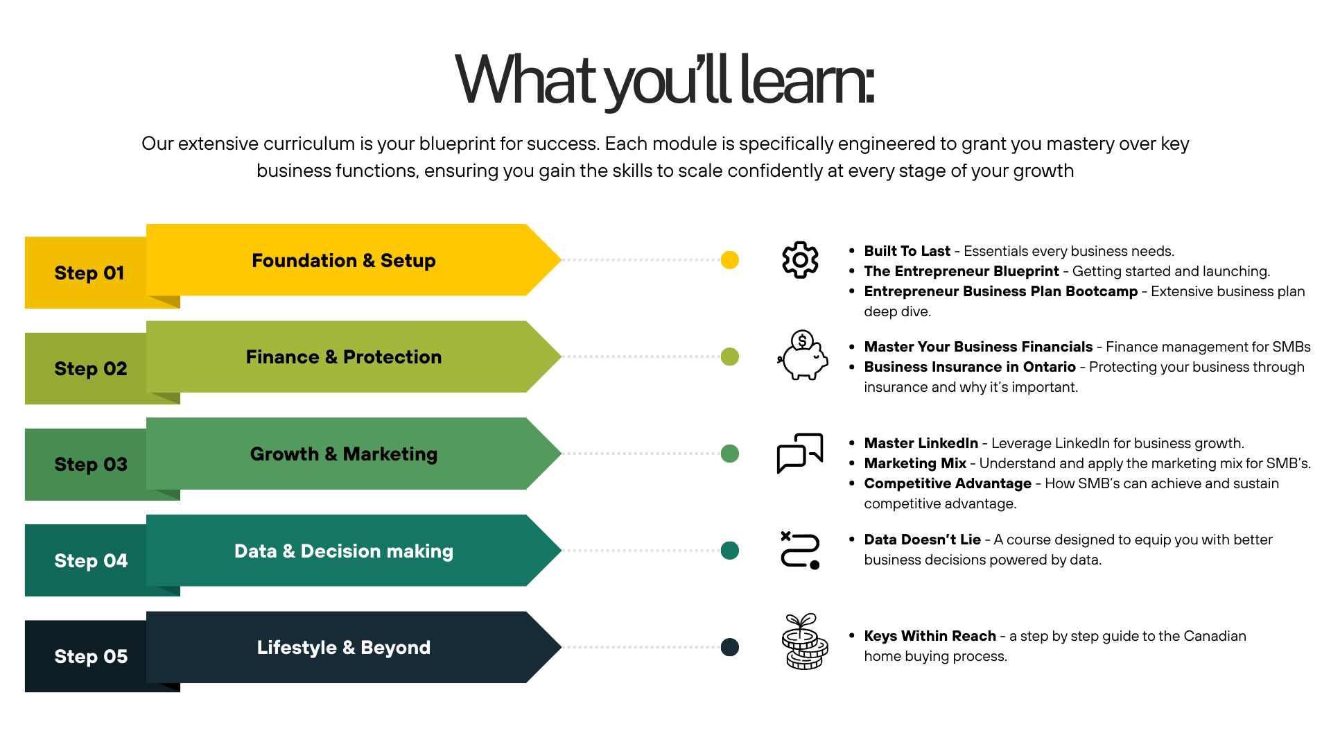 Entrepreneurship can feel overwhelming, but you don’t have to figure it out alone. Genesis is your guided pathway, blending real-world consulting expertise with step-by-step learning so you can turn your vision into a sustainable business. While other programs give you theory, Genesis gives you the blueprint and the team.